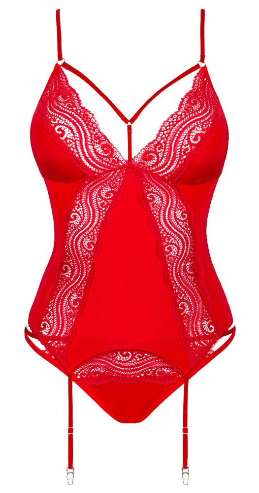 Obcisły top na szelkach i figi Diyosa marki Obsessive wykonane z miękkiego, elastycznego materiału z koronkowymi wstawkami podkreślającymi figurę. Z elastycznymi paskami między miseczkami. Ramiączka i paski do pończoch są regulowane. Pasujące majtki mają elastyczne paski z przodu w talii.