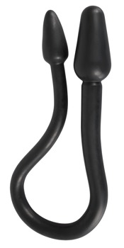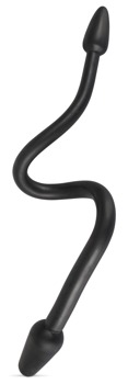 Bøjelig dobbeltdildo med en plug i hver ende. Ved solosex indføres den samtidig i vagina og anus, til fælleslege er der en plug til hver. Dejlig glidevenlig overflade. Sort.