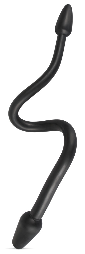 Böjlig dubbeldildo med en plugg i varje ände. Av ett väldigt glidvänligt material. Svart. Total längd: 76,5 cm, Ø 2-5,1 cm. TPE.