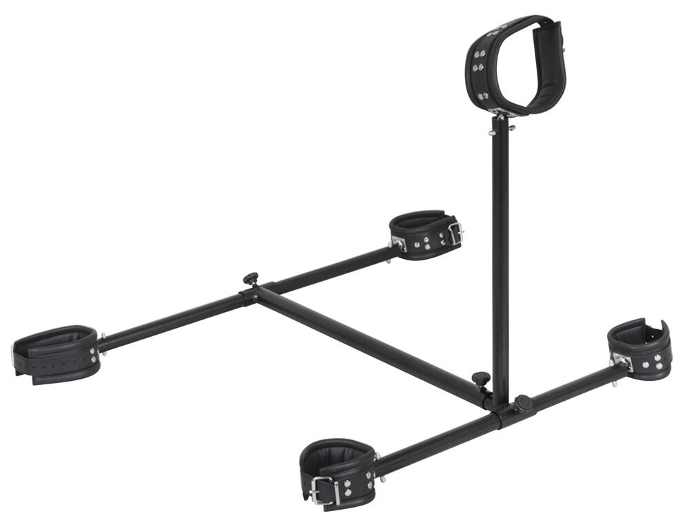 Juego de piezas, completo para armar una base para el piso, con todos los accesorios de montaje y dos soportes de tamaños distintos para la atadura de cuello. Fácil de montar y desmontar: Sólo montar las ataduras acolchonadas para cuello, manos y pies en la armadura de metal. Todas las ataduras con ajuste múltiple por medio de cierre de hebilla. Negro. Material: cuero partido, cuero metal.