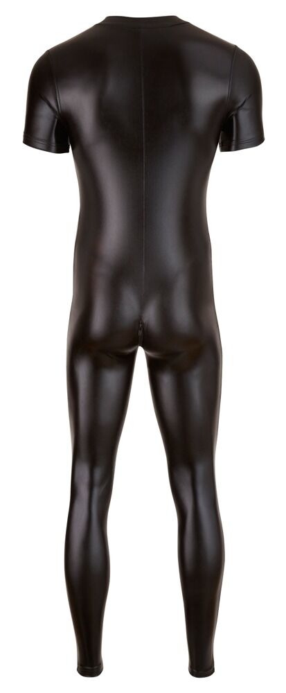 Sort herrejumpsuit i meget elastisk wetlook med 3-vejs-lynlås i front, der går hele vejen ned gennem skridtet. Med lange, smalle ben og korte ærmer. 92% polyester, 8% elastan.