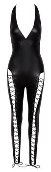 Stretchy jumpsuit from Cottelli PARTY made out of black matte look material. The jumpsuit clings to the body and has long, tight-fitting legs. There is lacing at the front and the back of the legs that also goes down the entire leg. With a practical/erotic 2-way zip over the crotch. Backless – halterneck with a clip fastener.