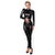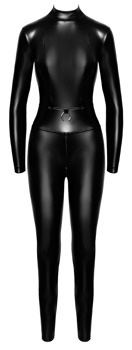 Langermet, svart overall fra Noir, som fremhever alle kroppens former. Det myke, elastiske stoffet legger seg inntil kroppen som en andrehud og føles svært behagelig. Smalt skåret fasong med ståkrage og glidelås bak. I livet foran er det en dekorativ ring (til kobbel, tau eller kroker). Glidelås over bryst og i skrittet som kan åpnes etter behov og lyst. Praktisk og forførerisk!
