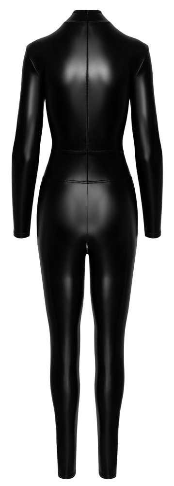 Betonande overall från Noir i svart powerwetlook - sitter som en andra hud. Mjuk och elastisk för maximal komfort. Tajt skuren stil med ståkrage, långa ärmar och ben samt dragkedja baktill. Med stor ring framtill (för koppel, bojor etc.) Med diskreta dragkedjor över brösten. Även dragkedja i grenen - både praktiskt och sexigt!