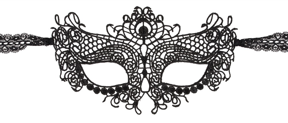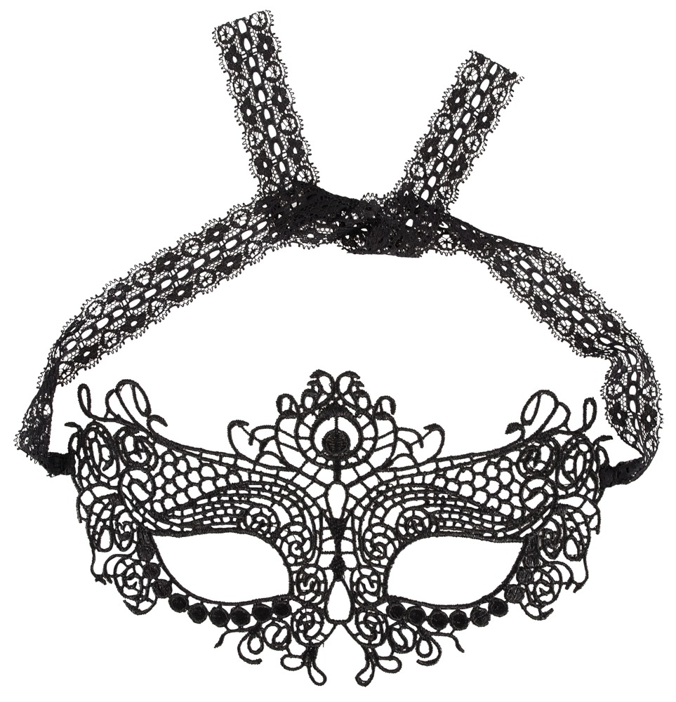 Vacker, svart mask av brodyr. Med öppningar för ögonen. Spetsbandet knyts baktill. 100% polyester.