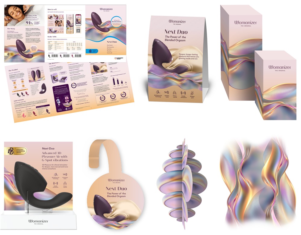¡Llama la atención ahora con el nuevo Next Duo de Womanizer con 3D Pleasure Air y G-Spot Vibrations! Kit de merchandising de varias piezas Grande con: