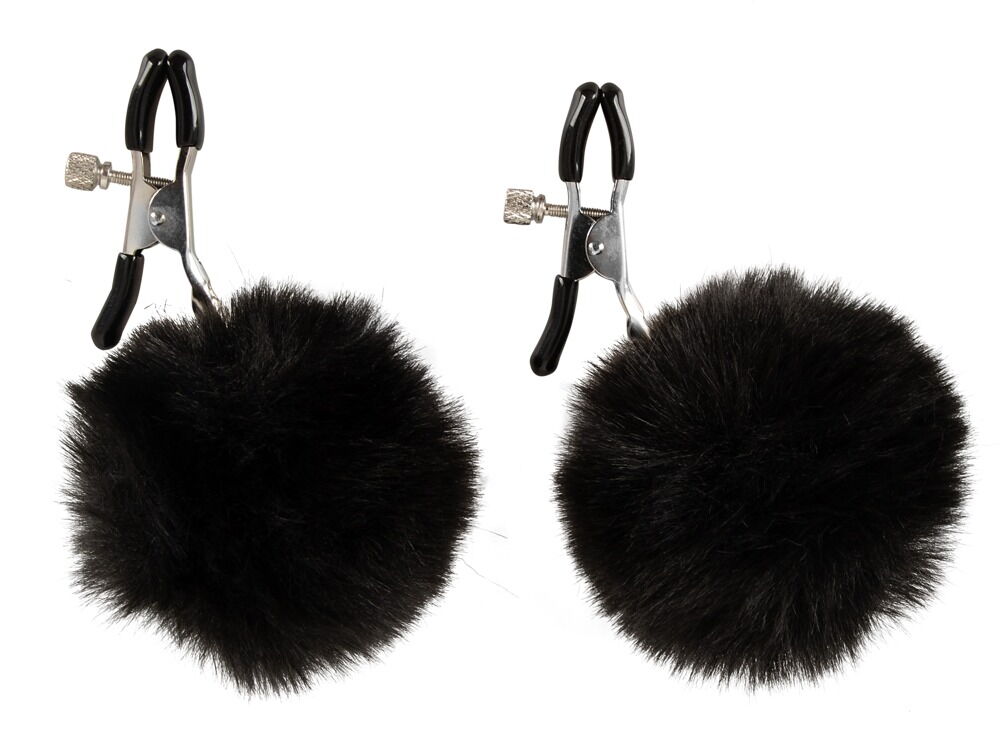 Disse to lette brystvorteklemmer i metal fra Magic Shiver holder et sensuelt blidt til spændende fast greb om brystvorterne. Med deres fluffy sorte pom-poms er de også et spændende blikfang. Klemmernes trykintensitet kan justeres efter ønske ved hjælp af justeringsskruer.