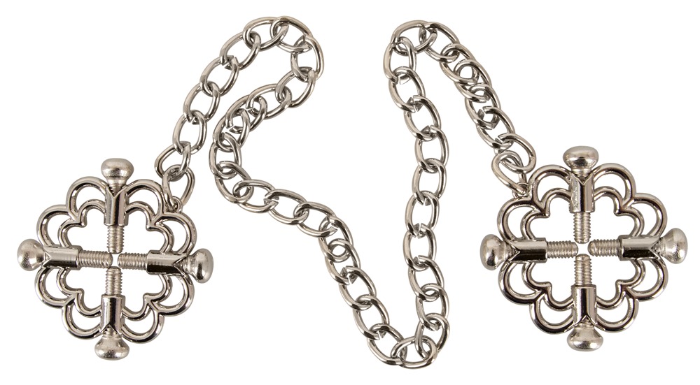 Brystvorteklyper med metallenke fra Bad Kitty med 2 pyntende brystvorteklyper. klyene er forbundet med ei lenke i metall. Alt i edelstål. Brystvorteklypene tar et fast grep om brystvortene med 4 justerbare skruer. Lenka mellom klypene dingler opphissende mellom brystene og drar i tillegg deilig. Forførerisk dristig både ♪4 se og føle!