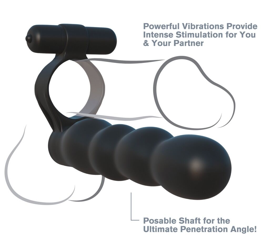 Posable Partner Double Penetrator von Fantasy C-Ringz. Stramm sitzender Penisring mit einsetzbarem Vibrobullet und fest arretiertem Anal-Kugeldildo. Der Penisring wird übergestreift und schon ist ER mit einem Doppelpenis und einem vibrierenden Klitorisstimulator ausgestattet, um sie dreifach zu beglücken! Der Penisring unterstützt dabei wirkungsvoll seine Erektion dank Blutstau-Effekt. Das kleine, kraftvolle Vibrobullet wird in die obere Schlaufe eingesetzt und sorgt für aufregend prickelnde Zusatzstimulationen - auch unter der Dusche oder in der Badewanne, denn das Vibrobullet ist wasserdicht. Inklusive Batterien (3 x LR44) für das Vibrobullet.