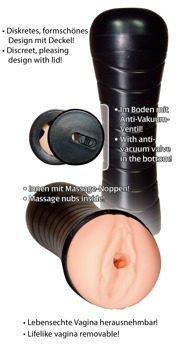 I en diskret svart designad burk gömmer sig under det snygga locket en naturtrogen vagina som skämmer bort dig med sina inuti liggande massagenoppor. Burken är 27 cm lång och 6,5-8 cm i Ø. Burken har en anti-vakuumventil i botten som gör att vaginan alltid är härligt slät och glidvänlig. Vaginan kan tas ut för rengöring.