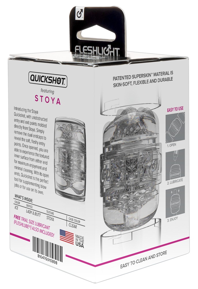 Hendig, liten masturbator Quickshot Stoya fra Fleshlight i gjennomsiktig hylster med deksel. Begge sidene kan penetreres, den ene har vaginaformet åpning, den andre anusformet. Begge er kopier av erotikkstjerna Stoyas underliv. Lystkanalen er i hudlignende Super Skin materiale, preget med forskjellig pirrestruktur, slik at nytelsen føles som en realistisk lystopplevelse med Stoya, som til og med har satt underskriften sin på forpakningen.