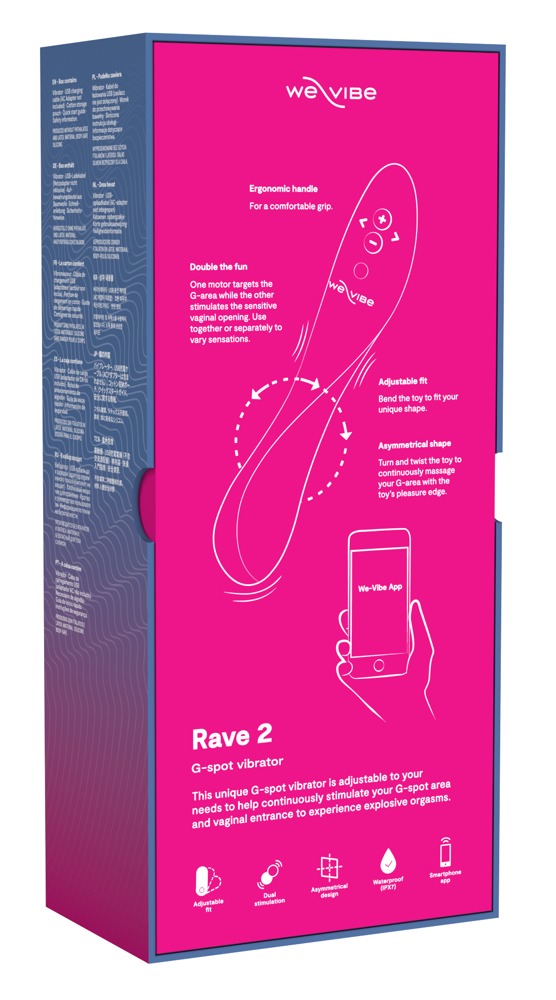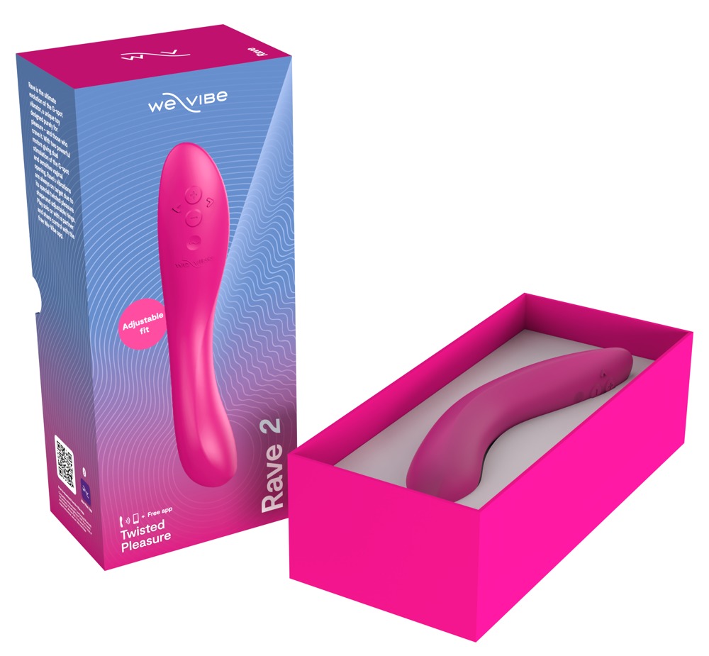 Vibratoren Rave 2 fra We-Vibe har unik buet og dreiet form, slik at G-punktet og den følsomme vaginaåpningen stimuleres samtidig med intensiv vibrasjon. Rave 2 har to motorer, en i tuppen og en i midten.