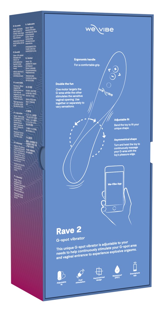 Vibratoren Rave 2 fra We-Vibe har unik buet og dreiet form, slik at G-punktet og den følsomme vaginaåpningen stimuleres samtidig med intensiv vibrasjon. Rave 2 har to motorer, en i tuppen og en i midten.