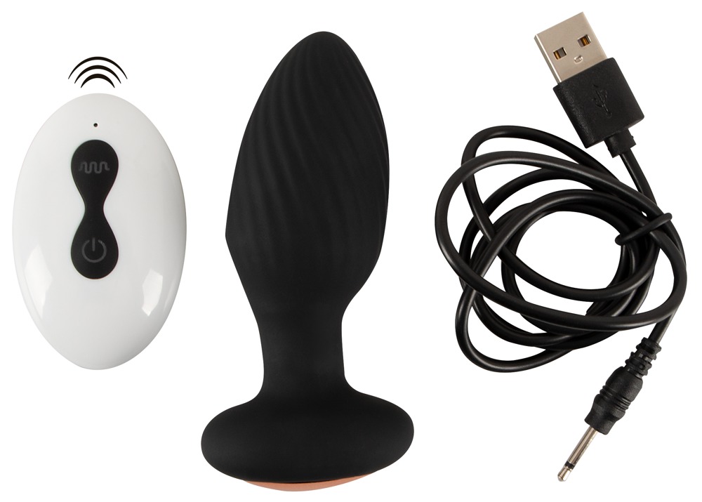 Udpræget spiralformet Vibro-Analplug RC Rotating Butt Plug fra ANOS med en travl roterende funktion i det konisk formede skaft. Kan let indføres og forkæler anus og analkanal på en unik og meget intensiv måde. Den er også velegnet til bad og brusebad, da den er vandtæt.