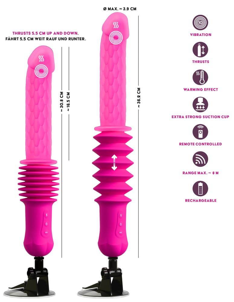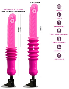 De stoten van de vibrator over een slaglengte van meer dan 5 cm kunnen worden geregeld in 3 snelheden. De vibraties in 10 verschillende standen. Allemaal handig te bedienen met de afstandsbediening (bereik 8 meter) of met één druk op de knop direct op het speeltje - apart of in combinatie. De kalmerende warmtefunctie tot 42°C biedt nog meer genot. Het verwarmt snel de zijdezachte dubbellaagse siliconen voor bijzonder soepel glijden en intense sensaties.