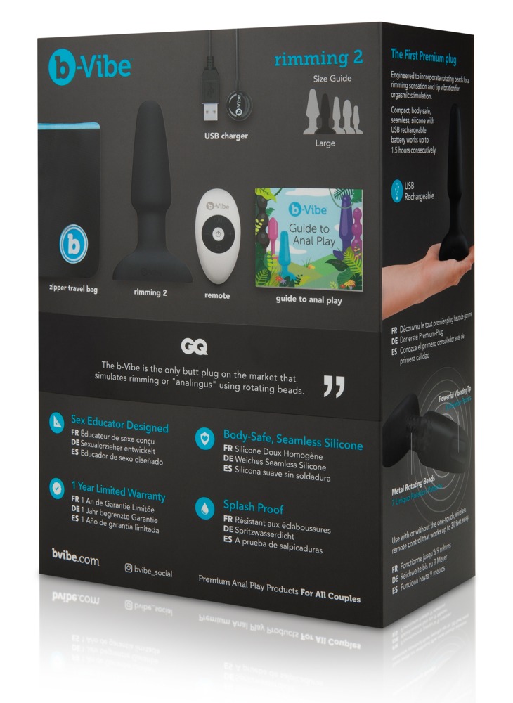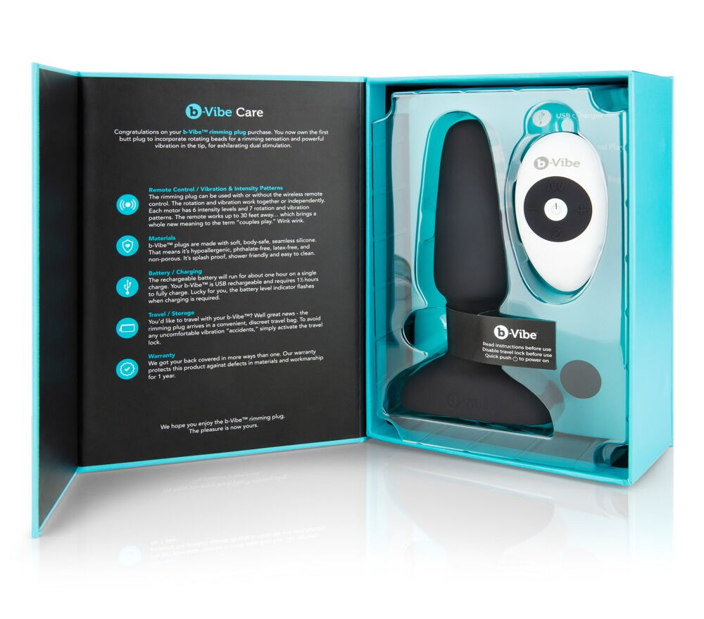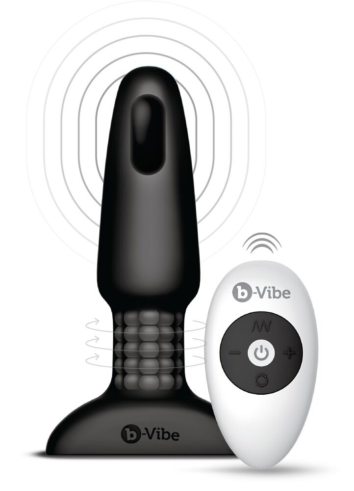 Anal plug rimming fra b-vibe med radiofjernbetjening til justering af vibrationer og rotationsperler i skaftet, men kan også reguleres direkte på pluggen. 6 vibrationstilstande, 7 rotationstilstande og 6 hastighedsniveauer kan kombineres. Med soft-touch overflade og stander. Inkluderer Click 'n' Charge USB-opladerkabel og hård taske til opbevaring.