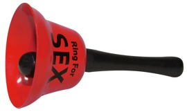 Rode metalen bel met "Ring for Sex" in zwart gedrukt.