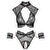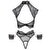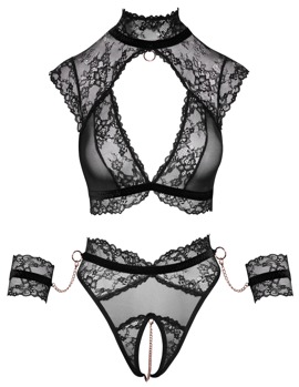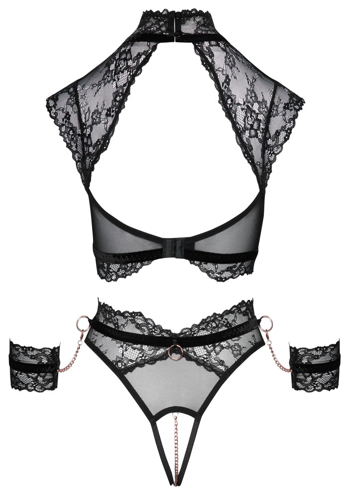 Sort sæt fra Cottelli BONDAGE med bh, skridtløse trusser og to bløde håndjern. Blødt, elastisk materialemiks af fine blonder og powernet med rosaguldfarvet tilbehør. Skulderdækkende blød bh med stor udskæring foran og bagpå. Høj blondekrave foran med ankelring, som lukkes bagpå med knapper. Ekstra hægtelukning bagpå. Højtaljede trusser med aftagelig, stimulerende kæde i det åbne skridt. En ring bag på linningen og i hver side, hvor de elastiske blondemanchetter kan hægtes fast med deres karabinhager.