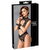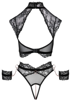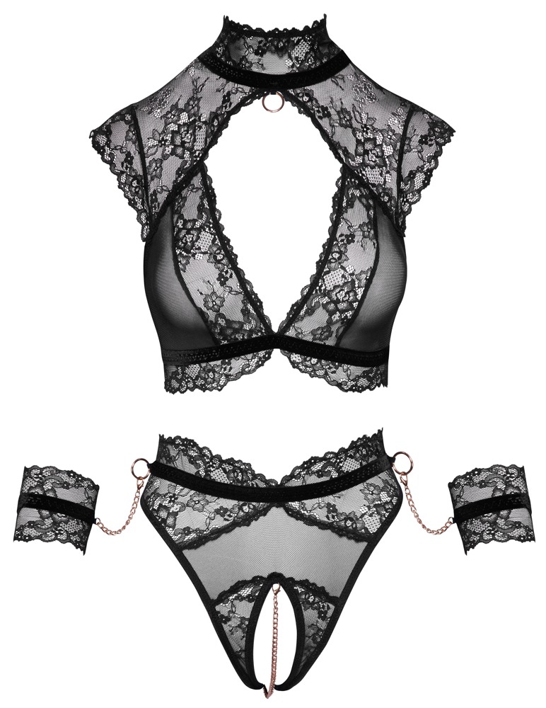 Svart set från Cottelli BONDAGE med behå, öppna trosor och två mjuka handbojor. Mjuk, stretchig materialmix av fin spets och powernet med roséguldfärgade accessoarer. Axeltäckande mjuk behå med stor utskärning fram och bak. Hög ståkrage i spets framtill med bondagering som knäpps baktill med knappar. Ytterligare hakknäppning baktill. Trosor med hög midja och avtagbar, stimulerande kedja i den öppna grenen. En ring på baksidan av linningen och på varje sida, i vilken de elastiska spetsmanschetterna kan hakas fast med sina karbinhakekedjor.