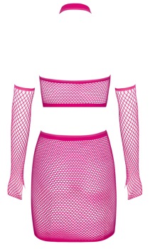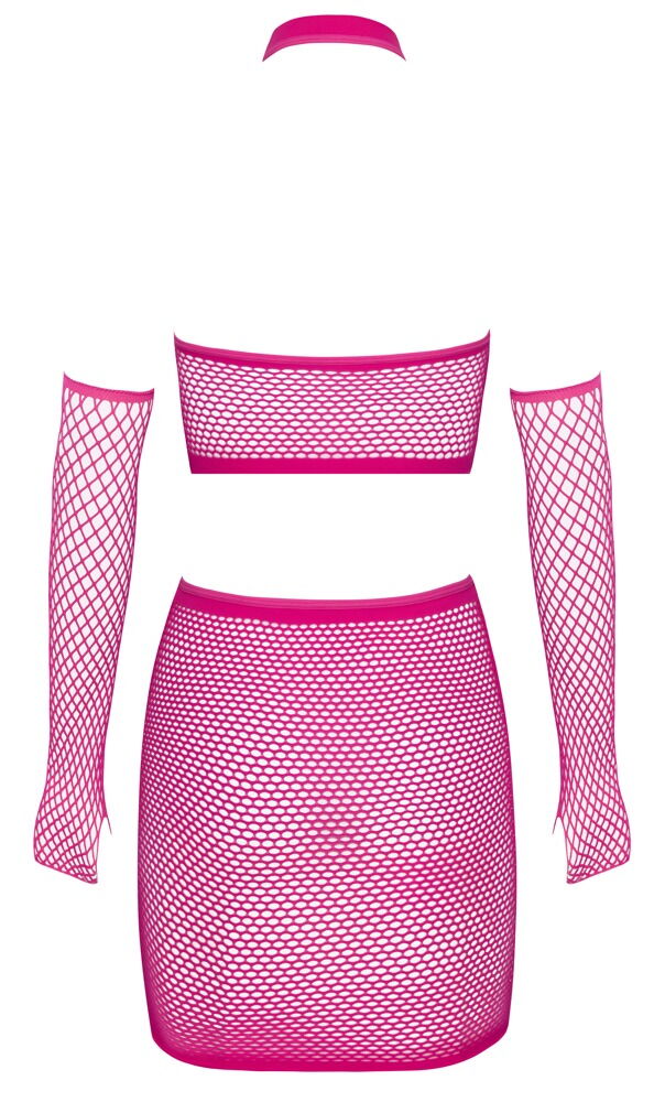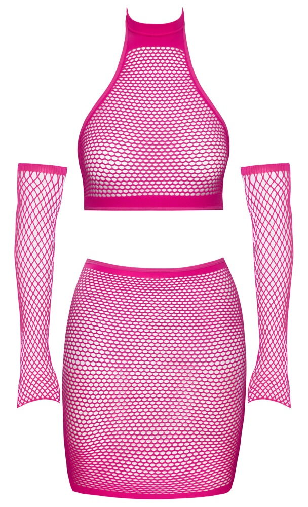 Pink net set from Cottelli FANTASY with a crop top, mini skirt and arm gauntlets. The soft and stretchy net clings to the body and fits like a second skin. Everything is seamless with soft borders for a very comfortable fit. The backless crop top has an extremely stretchy stand-up halterneck collar.