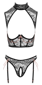 Spændende åbent sæt fra Abierta Fina med en barmfri top og skridtløse trusser med strømpeholdere. Fine, sorte, blomstrede blonder er forførende med fløjlsdetaljer og rosaguldfarvede kæder. Blød og elastisk over det hele for en høj grad af komfort. Top med skåle med bøjle for en perfekt barmfri pasform og justerbar hægtelukning bagpå. Ståkraven med hægtelukning, skulderblonderne og de justerbare stropper er helt aftagelige. Ligesom kæden med et smykkehjerte under skålene. Trusserne med strømpeholdere forfører i Rio-stil med høje benudskæringer. De justerbare strømpeholdere og den dobbelte kædekant i siderne og bagpå kan også tages af.