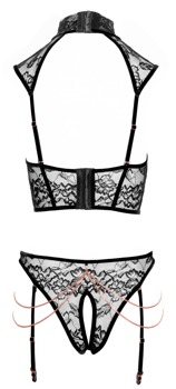 Ekscytujący komplet od Abierta Fina z topem bez biustu i majtkami bez krocza. Delikatna czarna koronka w kwiaty uwodzi aksamitnymi detalami i łańcuszkami w kolorze różowego złota. Miękki i elastyczny materiał zapewnia wysoki poziom komfortu. Top z miseczkami na fiszbinach dla idealnego dopasowania bez biustu i regulowanym zapięciem na haftki z tyłu. Stójka zapinana na haftki, koronka na ramionach i regulowane ramiączka są całkowicie odpinane. Podobnie jak łańcuszek z biżuteryjnym serduszkiem pod miseczkami. Majtki na szelkach uwodzą stylem Rio z wysokimi wycięciami na nogawkach. Regulowane paski do pończoch i podwójne łańcuszki po bokach i z tyłu można również odpiąć.