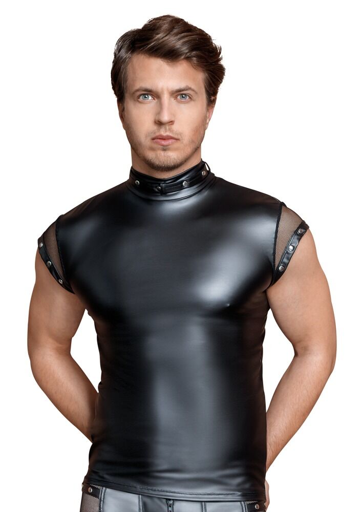 Svart herreoverdel fra NEK i fremhevende mattlook med naglepyntet, avtagbar reim på halsen. Korte ermer i nettingstoff, kantet med naglepyntede reimer. Myk, elastisk og behagelig å ha på!