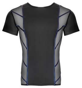 The tight-fitting, short-sleeved shirt from NEK is made out of cool black matte look material. There are transparent black net inserts at the sides with racy, sewn-on, diagonal stripes. The stripes are made out of metallic blue matte look material. The shirt is also soft and stretchy for a very comfortable fit.