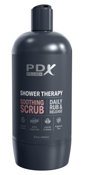 Masturbator Shower Therapy Soothing Scrub från PDX Plus ser utifrån ut som en neutral shampooflaska. Men skruvar man av bottenlocket upptäcker man en realistiskt formad vulva och vagina med noppstruktur för en intensiv penismassage. Flaskans lock fungerar som sugkontroll. Genom att man öppnar eller stänger så kontrolleras avsugningskänslorna.