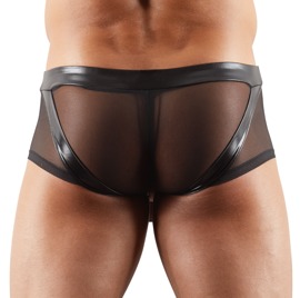 Svart boxer i powernet med fiksert penisring (diameter 5 cm). Linning og jockbånd i wetlook. Powernet 90% polyamid, 10% elastan, wetlook i 92% polyester, 8% elastan.