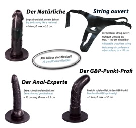 Pour ELLE et ELLE & ELLE et LUI ! Pour le plaisir-gode lesbien ou pour tous vos jeux de rôles coquins : Maintenant ELLE peut LUI faire plaisir même par l'arrière ! String straps-on avec trois différents godes noirs, en matière glissante et à fixer : Un gode pénis look nature (longueur 16 cm, ø 3,5 cm), un gode mince anal (longueur 15 cm, ø 1,5 - 2,5 cm), et un gode plié et parfaitement anatomique pour toucher le point-g (longueur 15 cm, ø 3,5 cm). Rien ne peut vous empêcher de réaliser enfin vos fantasmes les plus subtils. Strap-on-string réglable pour un maintien parfait. Incl. échantillon de lubrifiant. TPR, PVC, polyamide.