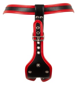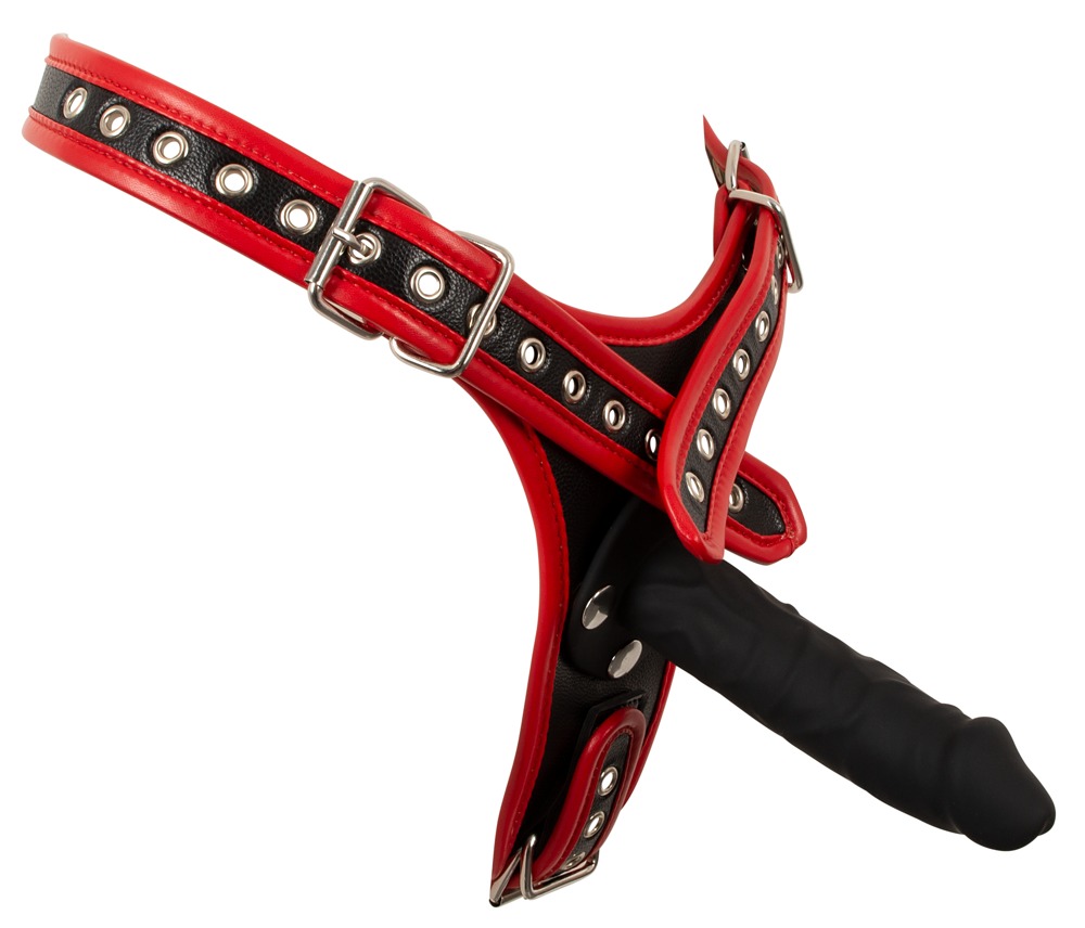 Strap-on strengtruse fra Bad Kitty i stilig jukselær inklusive 3 silikondildoer i ulik størrelse som kan settes inn i strengtrusas front eller skritt og festes per trykknapper. De kan også bytte plass. Strengtrusa justeres i størrelse med spenner i sida.