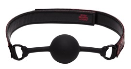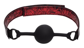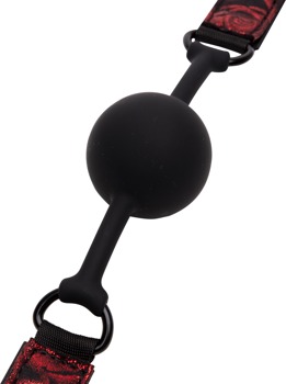 Siliconen knevel Sweet Anticipation Ball Gag van Fifty Shades of Grey met hoofdband die aan beide kanten gedragen kan worden. Een zijde in zwart lederlook, andere zijde met satijn in zwart/rood rozendessin. Comfortabele gewatteerde hoofdband, verstelbaar met klittenband.