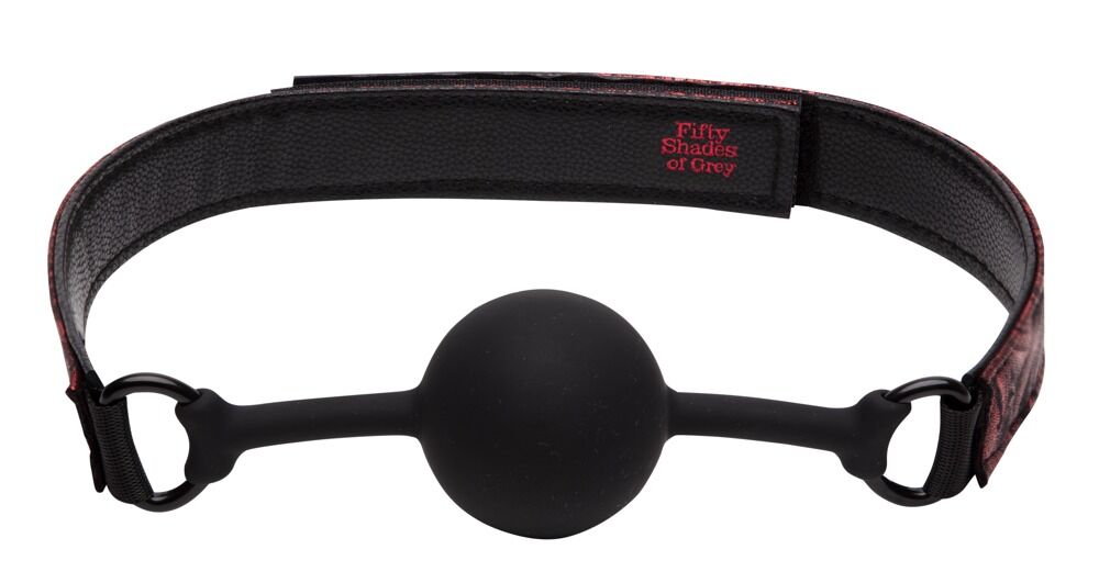 Gag in silicone Sweet Anticipation Ball Gag di Fifty Shades of Grey con fascia che può essere indossata da entrambi i lati. Un lato in pelle nera, l'altro lato con raso in design nero/rosa rossa. Comoda fascia imbottita regolabile con velcro.