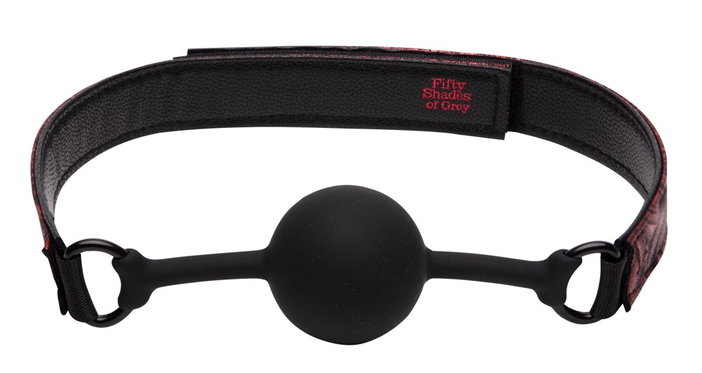 Silikonowy knebel Sweet Anticipation Ball Gag by Fifty Shades of Grey z opaską na głowę, która może być noszona po obu stronach. Jedna strona z czarnej skóry, druga strona z satyny w czarno-czerwony wzór róż. Wygodna wyściełana opaska regulowana na rzep.