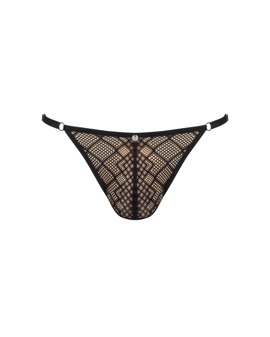 String noir Severio d'Obsessive dans une semi-transparence aux motifs extravagants. Doux et élastique pour un confort total. Confortable ceinture élastique avec petit élément métallique à l'avant et réglable.