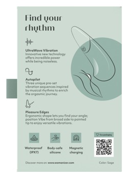 Der ergonomische und handliche Auflegevibrator VIBE von Womanizer begeistert mit neuer einzigartiger UltraWave-Technologie. Die tiefen kraftvollen Vibrationen verwöhnen die Klitoris und andere sensible Lustzonen intensiv, aber sehr sanft. Für unvergessliche Höhepunkte – ohne Überreizung! Der geräuschlose Linearmotor sorgt dabei für ein sehr diskretes und ungestörtes Vergnügen. Pure Lust – immer und immer wieder – ohne dass jemand etwas hört!