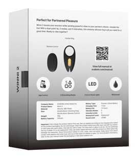 Anillo vibro-pene Winni 2 de SVAKOM, suave como la seda, con accesorio de estimulación vibratoria para el clítoris o los testículos, dependiendo de cómo se lleve el anillo en el pene. Se complace con 5 modos de vibración silenciosos en 5 velocidades cada uno. Las funciones se pueden controlar cómodamente por separado pulsando un botón directamente en el juguete, por control remoto o a través de la app SVAKOM desde cualquier lugar y en cualquier momento, incluso desde tu pareja. Incluso bajo el agua, porque Winni 2 es resistente al agua.