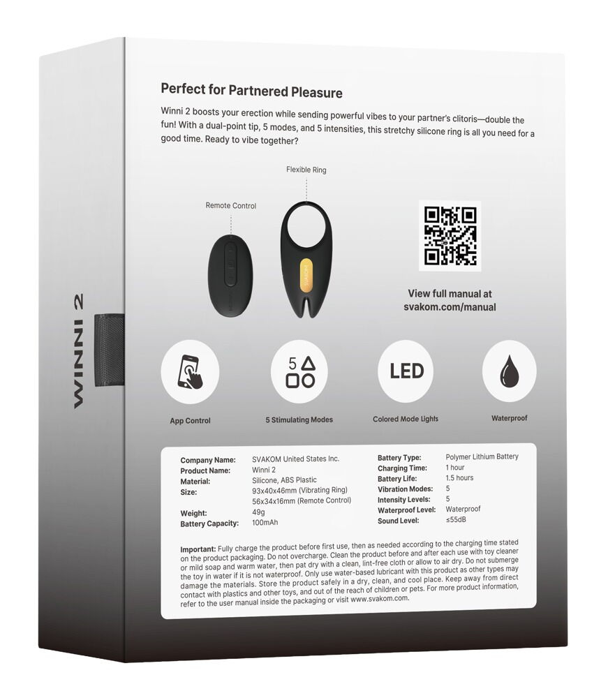 Sammetslen vibrerande penisring Winni 2 från SVAKOM med vibrerande stimulationspåsats för klitoris eller pung, beroende på hur man sätter ringen på penisen. Stimulerar med 5 tystgående vibrationsmodus i 5 olika hastigheter. Funktionerna styrs separat via knapptryck direkt på leksaken, med fjärrkontrollen eller med SVAKOM-appen när och var man vill - även av partnern. Winni 2 är vattentät så använd den gärna i/under vatten.
