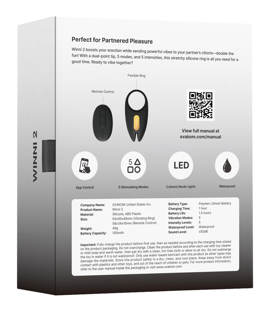 Vibropenisring Winni 2 fra SVAKOM med vibrerende stimuleringspåsats for pirring av klitoris eller pung, avhengig av hvilken vei ringen tres på penis. Nyt 5 stillegående vibrasjonsmodus i5 hastigheter hver, enkelt justerbare per tastetrykk rett på vibropenisringen, per fjernkontroll eller per SVAKOM app-en. Sistnevnte gir muligheter for kontroll uansett avstand mellom dere. Og ta gjerne med Winni 2 i badekar eller dusj, den er nemlig vanntett.