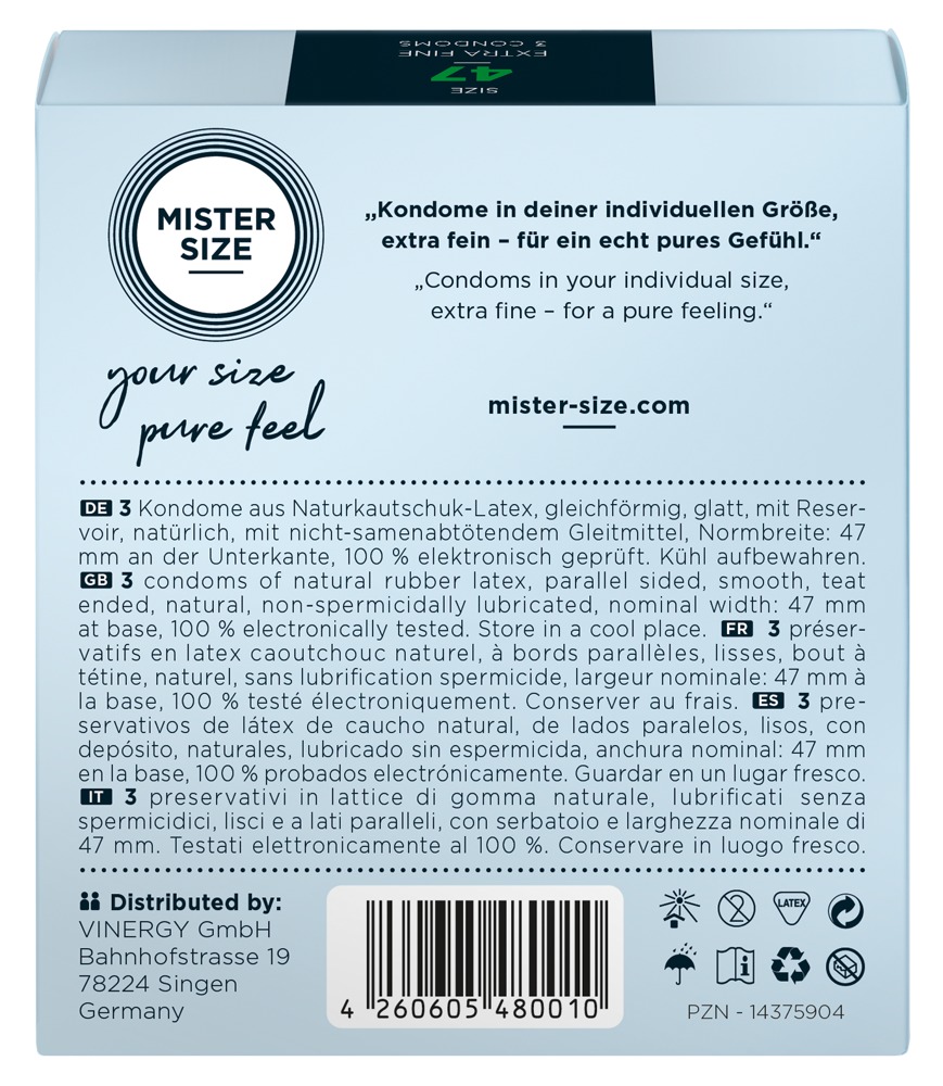 A man/woman can pick the right condom size for the penis by using the front of the packaging because there is a wide, dark blue measuring scale in the middle. Size 47 is suitable for a penis circumference of 9.5 to 10 cm.