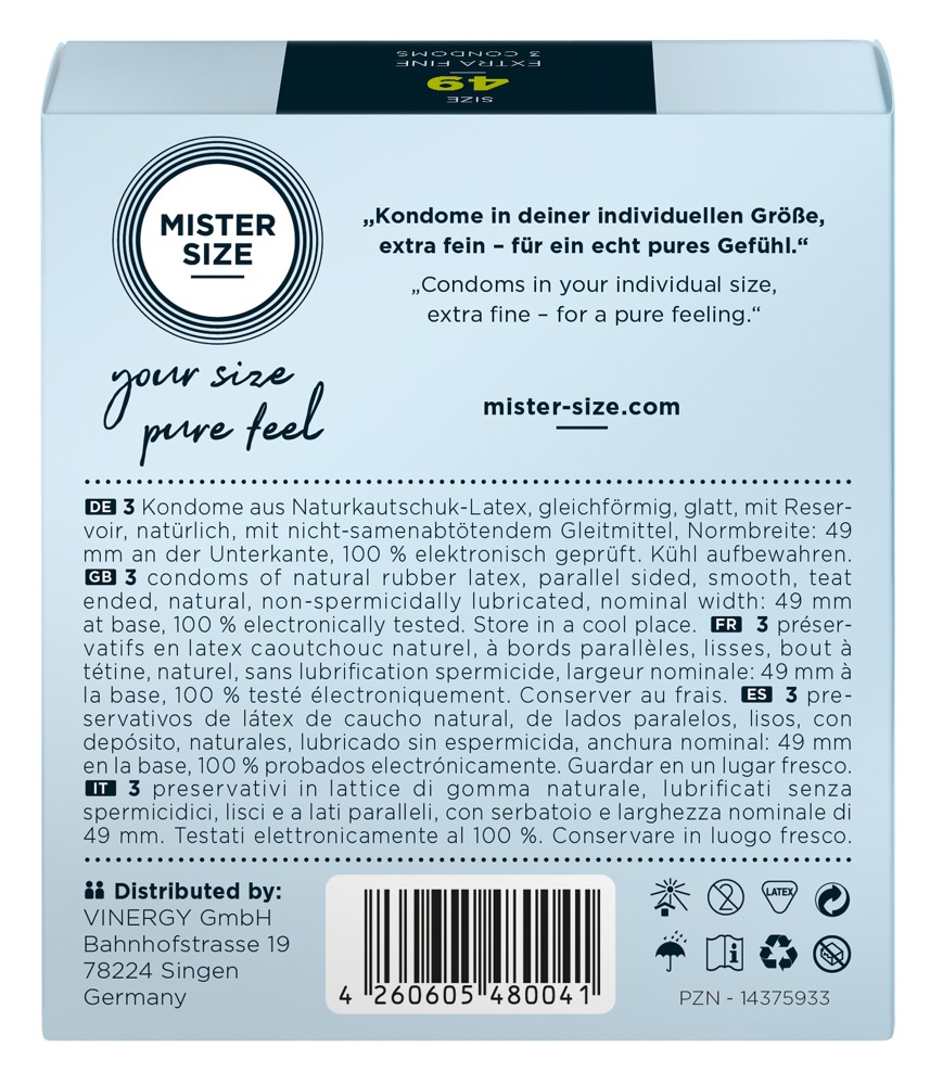 Przezroczyste, cienkie prezerwatywy Mister Size (49 mm) wykonane z naturalnej gumy lateksowej z powłoką nawilżającą i zbiorniczkiem. Wegańskie.