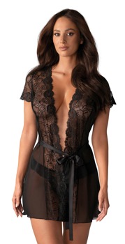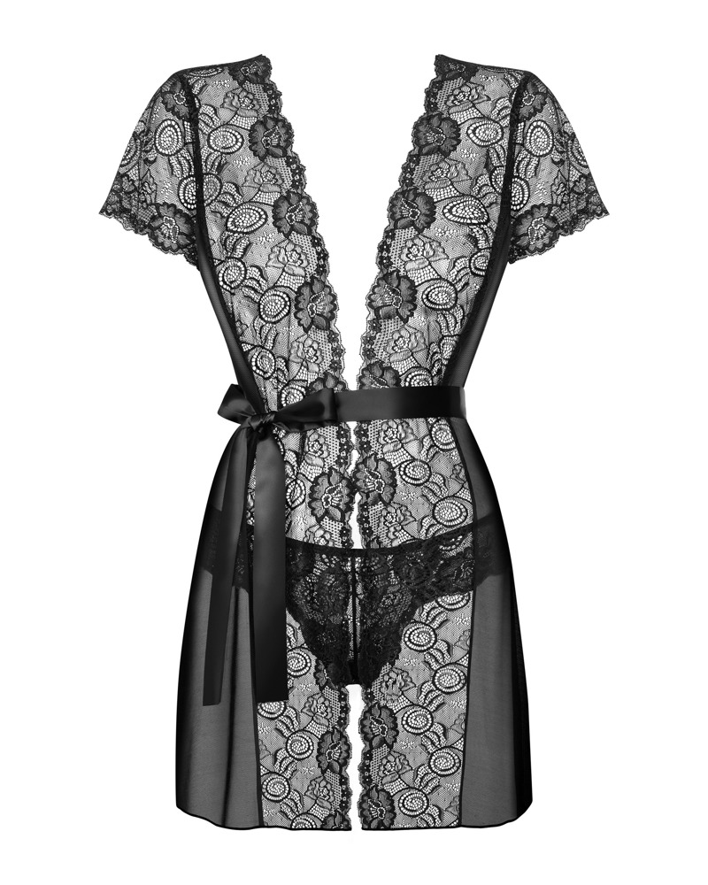 Elegante kimono corto e perizoma nel set Alluria di Obsessive. Fine trasparenza in tulle nero con maniche corte in pizzo e pizzo sul davanti. Morbido ed elasticizzato su tutto il corpo per un elevato comfort. Completamente aperto sul davanti con cintura di raso da annodare. Stringa realizzata interamente in pizzo floreale morbido ed elastico.