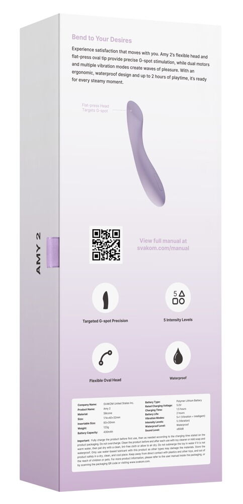 Ergonomicznie idealnie zakrzywiony wibrator Amy 2 od SVAKOM ze spłaszczoną końcówką specjalnie do ukierunkowanej stymulacji punktów przyjemności w ciele i na ciele. Miękki i jedwabisty, elastyczny silikonowy wibrator idealnie leży w dłoni i ślizga się po skórze i intymnych głębinach jak za dotknięciem czarodziejskiej różdżki. Intensywna stymulacja może być ekscytująco włączona do każdej gry solo lub miłosnej.