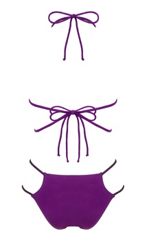 The bikini Balitta from Obsessive's Swimwear 2022 range is in a shiny purple colour. There is a bit of lining inside. The top has a halterneck and two straps underneath the breasts. The straps can be tied together. The waistband of the briefs are made up of two stretchy straps. The soft, stretchy material means that this bikini is a perfect fit and comfortable to wear when swimming and sunbathing.