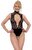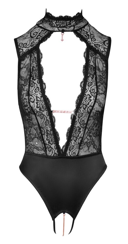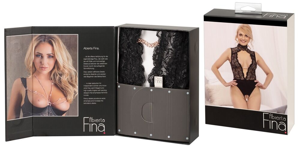 Sensacional body de Abierta Fina en look de dos piezas de fino y suave encaje y noble raso elástico. A pesar del cuello alto y bien abotonado, el gran recorte en la parte delantera y trasera es increíblemente provocativo. Un pequeño colgante de pedrería en el cuello y una brillante cadena de pedrería en la parte delantera son elementos adicionales que llaman la atención. La entrepierna completamente abierta también es muy tentadora, con una estimulante cadena que también se puede quitar.