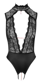 Läcker body från Abierta Fina i en tvådelad design av fin mjuk spets och ädel stretchsatin. Trots den höga ståkragen är bodyn otroligt provocerande med den stora urringningen framtill och baktill. Med liten strassberlock på kragen och en glittrande strasskedja framtill. Bodyn har en inbjudande öppen gren med en stimulerande, avtagbar kedja.