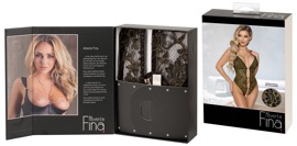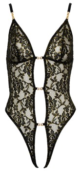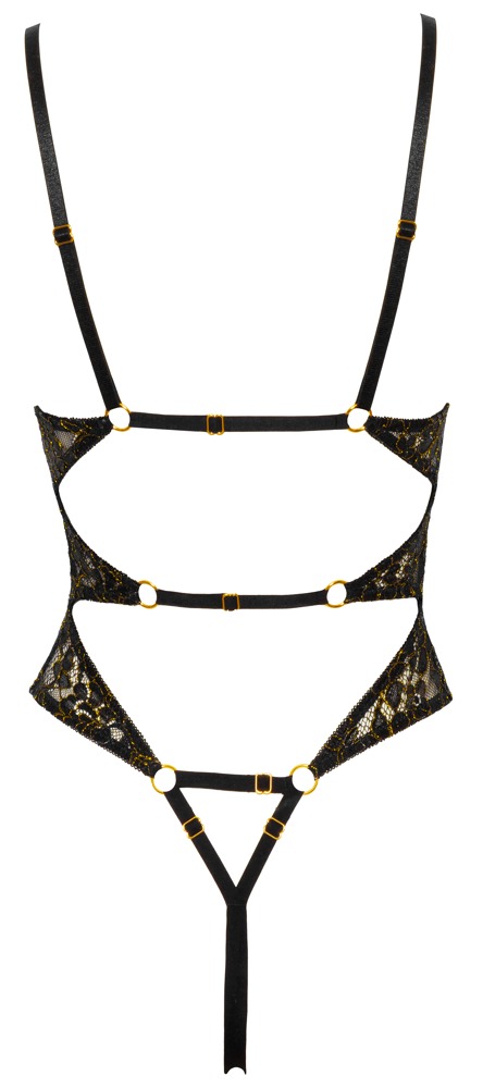 Elegantly and erotic body from Abierta Fina made of black floral lace with woven-in gold-coloured, metallic threads. The completely open front is only held together by 3 decorative glitter bridges. There are also sparkling elements at the front of the adjustable straps. Adjustable stretch straps on gold-coloured rings at the almost open back and over the open bottom ensure a perfect fit.