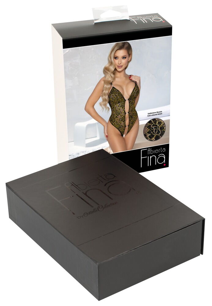 Elegancko erotyczne body sznurkowe marki Abierta Fina wykonane z czarnej, kwiatowej koronki z wplecionymi metalicznymi nitkami w kolorze złota. Całkowicie otwarty przód utrzymywany jest jedynie przez 3 ozdobne brokatowe paski. Również elementy brokatowe z przodu na regulowanych ramiączkach. W prawie wolnych plecach i nad wolnym dołem regulowane elastyczne ramiączka na pierścieniach w kolorze złota zapewniają idealne dopasowanie.
