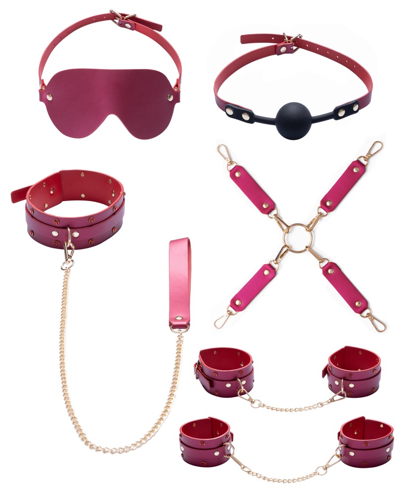 6-delt bondage-sæt fra Bad Kitty i fint, pinkfarvet kunstlæder i et sofistikeret perleglans-look. Guldfarvede beslag og kæder samt funklende rhinsten understreger det trendy glamour-look. Et stilfuldt bondage-sæt til nysgerrige og kendere: komplet med snor, øjenmaske og gag til alsidig leg væk fra hverdagen. De behagelige hovedstropper og manchetter kan hurtigt sættes på med spænder og justeres, så de passer, mens kæderne med karabinhager alle kan tages af.